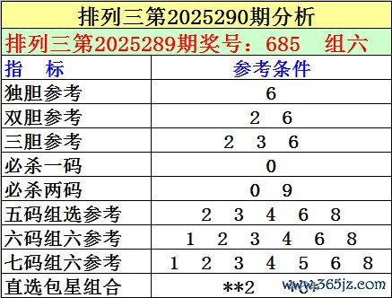 1.陈设三最近十期差异开出号码:539-707-096-057-247-905-641-180-504-685,其中有7期奖号开出了上期的叠加号码,本期预测第2025289期奖号:685中有重号,参考号码:6。